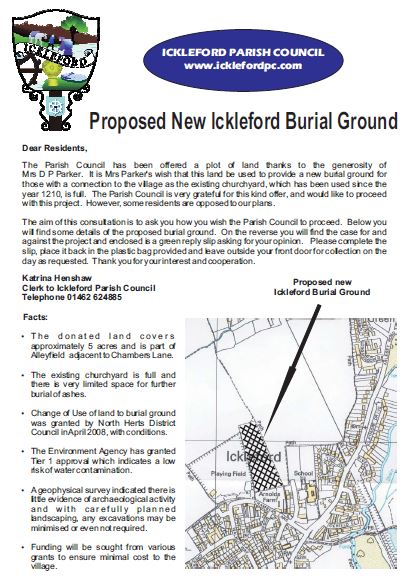 An initial planning application was lodged in 2005 and there then followed a number of archaeological, aerial photography, geophysical and desktop surveys to investigate feasibility of using the site, in conjunction with the Environment Agency and the County Archaeologist. In early 2008 an application for change of use of the land (from agricultural to burial ground) was granted and a subsequent survey of village residents demonstrated the desire to progress to full planning, which was granted by NHDC in March 2009.